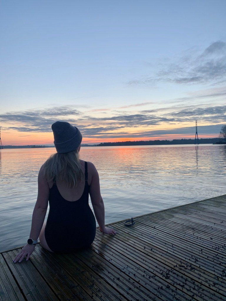 Vedestä noustaan yhtä rauhallisesti kuin sinne mennäänkin. Kylmä saattaa viedä vähän tuntoa, joten saatat helposti kolhia itseäsi, jos lähdet hätiköimään. Muista myös että paljas, märkä iho ja metalli eivät ole hyvä yhdistelmä, joten jos portaikossa/tikkaissa joissa menet veteen on metallia, käytä hanskoja ja jalkineita! Kun olet noussut vedestä, suosittelen hetkeksi istahtamaan alas ennen saunaan menoa tai vaatteiden pukemista. Itse tykkään viettää hetken pihalla, tuulelta suojassa hetken ja samalla hörppästä vähän makuvichyä. Minuutin sisällä siitä kun olet noussut vedestä valtaa kehon todella euforinen olo. Huomaat kyllä kun iskee. Varoitus! Tämä fiilis on todella addiktoiva.