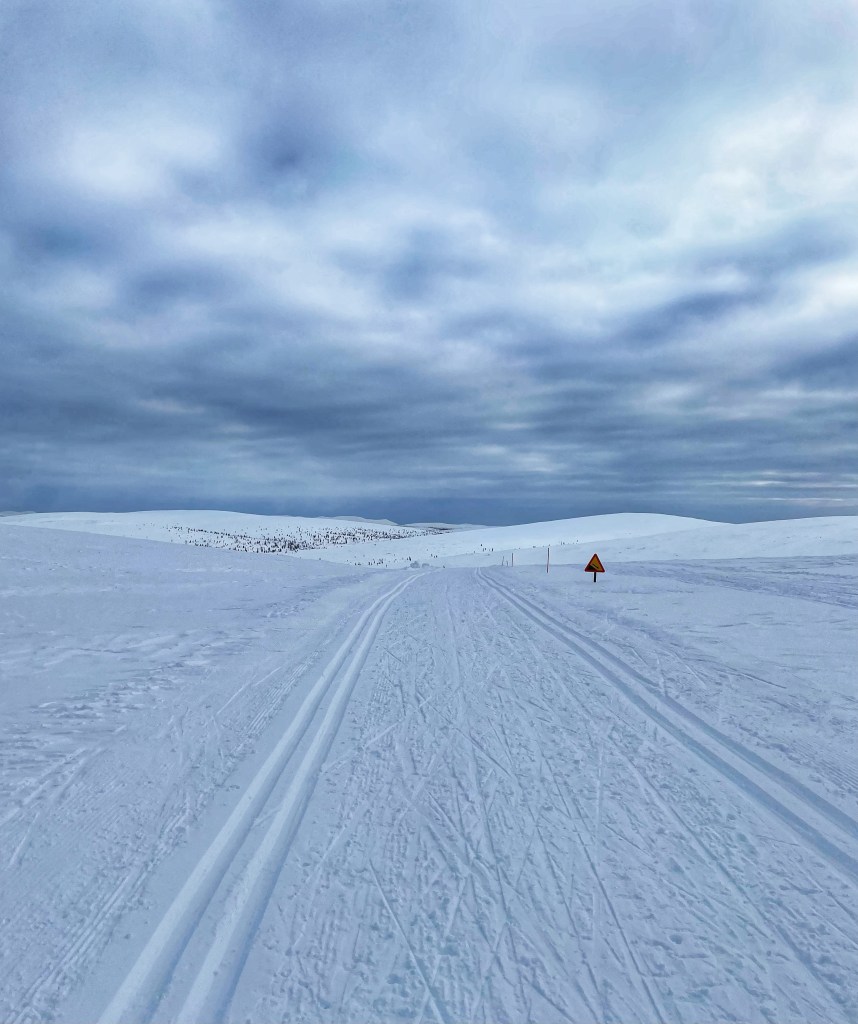 Perjantaina pakkasimme aamupalan jälkeen eväät ja vaihtovaatteet reppuun ja lähdimme tekemään vähän pidempää lenkkiä. Aloitimme Saariselältä ja otimme suunnaksi Rumakurun. Meitä yllätti kuinka mäkistä maasto oli. Silmämääräisesti saattoi näyttää että mentiin tasaisella, mutta hiihto tuntui silti todella raskaalta. Ihmettelimme, että miksi ihmeessä tulimme ensimmäiset 5 km niin hitaasti, kunnes katsoimme jälkikäteen että olimme nousseet kokoajan 😅 Pidimme ensimmäisen pysähdyksen Luulammen kahvilassa, joka ennakkotiedoista poiketen olikin auki. Munkin ja limun voimalla jaksoimme lähteä kiipeämään Kiilopään päälle. Nousu yllätti pituudellaan, samoin tuuli ja tuiverrus vaan lisääntyi mitä korkeammalle pääsimme. Loppunousu meni kyllä ihan kävelyksi suksilla, varsinkin kun nousu vaan jyrkkeni huippua kohti. Saimme kuitenkin piristystä vastaan laskevista hiihtäjistä: Muutamalla on niin leveä hymy kasvoilla että ihan nauratti 😄 Sama laskun huuma oli meilläkin pian edessä.