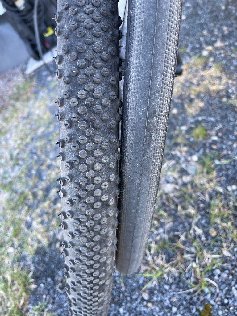 Päädyin hankkimaan graveliini myös maantierenkaat, koska suurin osa lenkeistäni kulkee pääosin asfaltilla tai ainakin voin valita reittini niin, että kuljen vain päällystettyä tietä. Haaveissani on pidemmät lenkit, joten vauhdikkaammat renkaat alkoivat houkuttelemaan. Gravelissa eniten suorituskykyyn asfaltilla vaikuttaa leveät renkaat, jotka aiheuttavat luonnollisesti enemmän vierintävastusta. Triathlon-seurassani vinkattiin, että vaihtamalla graveliin maantierenkaat voi nostaa keskinopeutta jopa 2-4 km/h. Gravelin ajoasentoa on vaikeampi muuttaa yhtä aerodynaamiseksi kuin maantiepyörässä, koska pyörän mitoitukset ovat hyvin erilaiset ja gravelilla ajoasento on hieman pystympi maantiepyörässä. Mutta jo tuolla renkaiden vaihdolla voi saada tuntuvaa muutosta, joten se kuulosti kokeilemisen arvoiselta asialta. Myös aerotankoa vinkattiin, jotta ajoasentoa saa matalammaksi ja lähemmäksi triathlonpyörän ajoasentoa. Sitä en ole vielä hankkinut, mutta ehkä jossain vaiheessa sekin tulee eteen.
