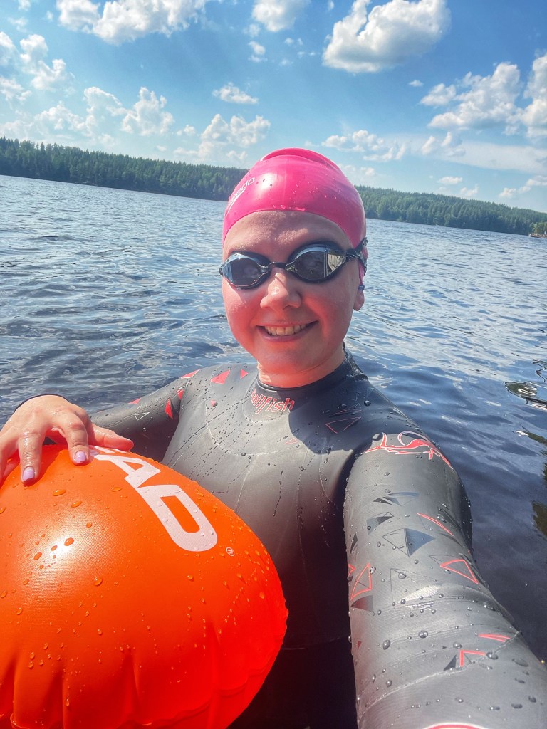 Kesäkuussa pääsin aloittamaan avovesitreenit kun tilaamani märkäpuku saapui. Ensimmäistä kertaa pukua päälle pukiessani voin sanoa että olin lievästi kauhuissani, sen verran makkarankuorelta se tuntui 😅 Pukemisessa meni myös oma aikansa, mutta onneksi ystäväni oli vinkannut märkäpuvun pukemisen opastusvideon, jonka avulla selvisin edes jotenkin oman arvon tuntoni säilyttäen. Kesäkuussa alkoivat myös TriathlonSuomen kesätreenit, joihin olin ilmottautunut uinnin osalta. Ensimmäiset treenit olivat Vantaan Kuusijärvellä, jossa onkin hyvät mahdollisuudet avovesitreeneihin. Ensimmäiset kerrat harjoiteltiin suunnistamista ja peesaamista. Suunnistaminen onnistuu jo ihan hyvin, mutta peesaamisessa on vielä parantamisen varaa 😅 Treeneistä jäi käteen myös hyviä avovesitekniikkadrillejä, joista omana lempparina myyräuinti.