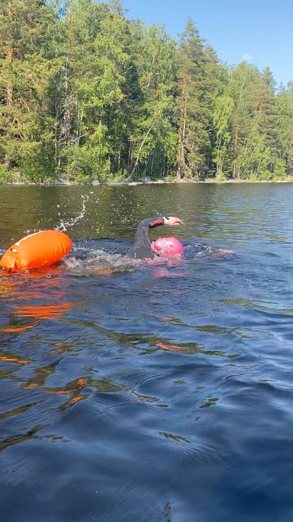 Koska yhteistreenit keskittyivät aika paljon tekniikan hiomiseen, oli kiva loman alkaessa suunnata vanhempien mökille ja jatkaa siellä matkapainotteisempaa treeniä. Loman alkuun osuivat myös kovat helteet, joten vesi toimi oivana virkistyksenä yli +30 asteen helteessä. Pääsin myös testaamaan miten märkäpuku toimii suojana iskuilta, uin nimittäin suunnistaessani suoraan päin kiveä 😅 Puku pehmensi kivasti, muuten olisi varmaan nahkat lähtenyt jaloista. Järvi, jossa vanhempieni mökki sijaitsee, on hyvin tunnettu monista kivistään, joita varsinkin veneilijät kiroavat. Täytyy sanoa, että eivät ne kyllä uimareidenkaan lemppareita ole. Muutenkin tuo järvi on yksi pelottavimmista mitä tiedän – se on hyvin syvä, täynnä kiviä ja puita, paljon veneilijöitä.. Välillä tuntuu, että avovesiuinnin kannalta on parempi mitä vähemmän tietää järvestä jossa ui, silloin ei ainakaan tarvitse etukäteen jännittää mitä eteen tulee. Toki turvallisuuden takia kannattaa perusasiat kuten virtaukset selvittää, mutta niitä harvemmin pienemmissä, avovesiuimareiden suosimissa järvissä onkaan.