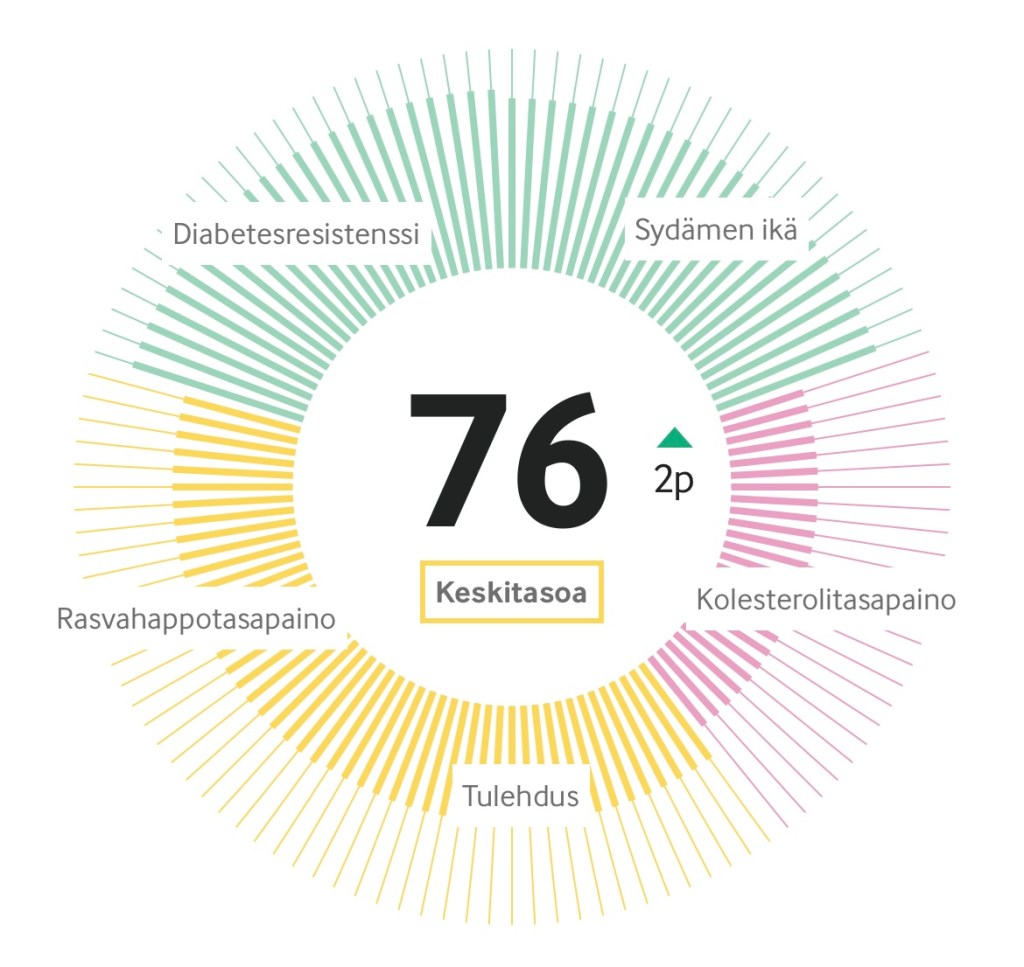 Vastoinkäymisistä huolimatta tulokseni oli parantunut, jee! 🙌 Ei tosin kovin monella pisteellä, mutta parantunut kuitenkin! Olen erittäin iloinen siitä, että sydämeni ikä on nyt itseni ikäinen, ja se osio on muuttunut punaisesta vihreäksi (viime mittauksessa se oli 3 vuotta minua vanhempi). Kaikki muut osiot ovat pysyneet joko samassa tai pikkaisen parantuneet. Tämä toimii hyvänä muistutuksena siitä, että terveydelleen voi tehdä hyviä asioita ihan vain ruokavaliota viilaamalla ja vaikkei paino muuttuisi mihinkään. Väkisinkin tosin mietin, että millainen lukema minulle olisi tullut jos olisin tehnyt mittauksen ennen koronaa. Mutta olen super iloinen että terveyteni suunta on oikea – parempaan päin!