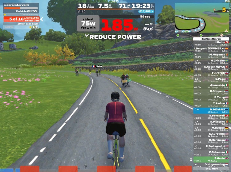 Zwift on pelillistetty treenaussovellus, jonka avulla älytrainerista saa parhaimman hyödyn irti. Zwift on mielestäni aika arvokas (20€/kk tai 200€/v), mutta hetken sitä käytettyäni voin sanoa että se on kyllä jokaisen pennin arvoinen. On olemassa myös ilmaisia vaihtoehtoja, mutta itse päädyin Zwiftiin sen suorastaan kulttimaisesta maineesta johtuen. Halusin päästä osaksi Zwiftaajia! Eikä pelin ympärillä ole turhaan kohistu – se on rakennettu niin, että tekee mieli polkea ja kilpailla muiden kanssa. Zwiftissä voi ajaa valmiita reittejä, näistä tunnetuimpina varmaan Zwiftin oma fantasiamaailma Watopia. Myös tunnettuja pyöräilykohteita löytyy reittivaihtoehdoista. Kun pelaaja (=polkija) valitsee reitin ja aloittaa polkemisen, simuloi peli maaston kohtia älytrainerin avulla lisäämällä tai keventämällä vastusta maastonmuodon ja -pohjan mukaan. Eli suomeksi ylämäet tuntuu ja vaihteita pitää pienentää ja alamäet taas mennään lujaa ja kevyemmällä vastuksella. Reittien lisäksi on mahdollisuus osallistua erilaisiin eventteihin ja kisoihin tai polkea valmiiksi määriteltyjä tai itse tehtyjä treenejä. Pelissä on myös sosiaalinen puoli, eli voit chattailla muiden kanssa ja peukuttaa kun joku tekee omia ennätyksiä. Ja kaikesta saa tietysti pisteitä, jotka nostavat omaa leveliä ylöspäin. Erilaiset haasteet myös motivoivat polkemaan, kuten esimerkiksi Everest challenge, jossa tarkoitus kiivetä yhtä monta nousumetriä kun on Everestissä.