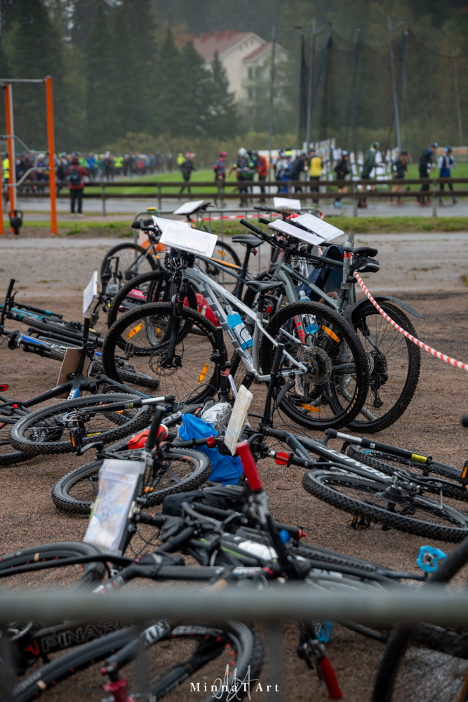 Lähtöviivalla ei vieläkään ollut ihan selvää millainen kisa meillä olisi edessä, koska kumpikaan meistä ei ollut ikinä osallistunut seikkailukisaan eikä suunnistanut pyörän kanssa. Lähtöpamauksesta lähdimme muiden perässä kirmaamaan kohti ensimmäistä karttaa ja juoksusuunnistustehtävää. Heti kartan käteen saadessani tuli hyvin selväksi että ainakin tämä ensimmäinen suunnistusosuus olisi hyvin helppo, siis ihan ala-astetason suunnistusta. Se vähän jopa harmitti, koska toivoin että suunnistustaidoista olisi ollut enemmän hyötyä kisassa, mutta voin jo nyt paljastaa että juosten tehtävät suunnistusosiot olivat kyllä jopa omaan makuuni ihan liian helppoja. Ensimmäisestä suunnistusosuudesta vaihdoimme noin ensimmäisen kymmenikön joukossa pyörien selkään ja lähdimme suunnistamaan kohti ensimmäistä pyörärastia. Suunnistusta harrastaneena vähän ahdisti se, että 1:20 000 kartan lukeminen pikkutarkasti rastien kohdalta oli hankalaa ja monesti rastien sijainnnin joutui vähän arvaamaan. Mutta vihdoinkin tultiin siihen osuuteen jossa suunnistuksen osaamisesta oli jotain hyötyä! Vaikka rastien sijainnit olivat aika hyvin polkujen ja teiden lähistöllä, vaati reittien suunnittelu ja maaston lukeminen vauhdissa hieman suunnistusosaamista ja veikkaan että tässä me onnistuimme parini kanssa hyvin, koska yhtä pientä koukkua lukuunottamatta löysimme rasteille aikalailla suoraan. Pyöräilyosuus oli kyllä ehdottomasti oma lempparini, vaikka reitti välillä menikin aika hankaliakin polkuja pitkin, ainakin kun kummallakin meillä oli ihan muut kuin maastopyörät allamme 😅 Minulla gravel ja parillani perushybridipyörä. Polkuosuudet olivat onneksi aika lyhyitä, joten niistäkin selvisi hyvin ilman maastopyörää, mutta pidemmille/haastavimmelle sarjoille kyllä varmasti olisi hyötyä maastopyörästä. Yllätyin, kuinka hyvin pyöräsuunnistusosuus sujui meiltä vaikkei kumpikaan ollut sitä aiemmin tehnyt!