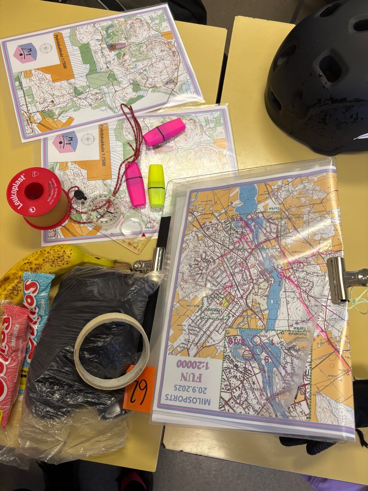 Koska laji oli itselleni täysin tuntematon, piti aika montaa asiaa lähteä selvittämään googlen avulla: mitä kisoissa tapahtuu, mitä tarvitsen mukaan, onko jotain lajisääntöjä jne. Jos tätä nyt lukee joku, joka järjestää matalan kynnyksen seikkailukisoja, joissa on nimenomaan sarjoja myös ensikertalaisille, olisi kiva jos heille olisi jotain ohjeistusta mukana joko kilpailusivustolla tai -ohjeissa. Saimme parini kanssa muutaman blogikirjoituksen avulla vähän hahmoteltua mitä kannattaa kisaohjeiden varustelistan lisäksi ottaa mukaan. Monet kisajärjestäjät kertovat ohjeissaan pakolliset välineet (esim. pyörä ja kypärä) sekä suositeltavia välineitä (esim. kompassi, juomaa, energiaa), mutta sitten sen lisäksi on muitakin välineitä jotka voivat olla hyödyllisiä ja nämä ovat niitä, jotka tietää vasta kokemuksen kautta. Sen huomasimme itsekin kisan aikana 😄 Ja nämä varmastikin muuttuu myös kisoista ja lajeista riippuen. Mutta tässä mitä me huomasimme tärkeiksi ihan jo muutaman tunnin kisassa (kisajärjestäjän listan lisäksi):